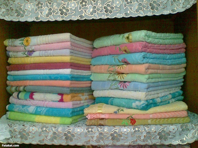رصة الفوط والملايات داخل الدولاب هنبدأ بالملايات وعندى اكتر من طريقة اختارى حسب مساحة دولابك وعدد ملاياتك 1/ حطي كل ملاية فى غطا الخدادية بتاعها هتبقى بالمنظر ده وبتتحط فى الدولاب 2/الطريقة العادية ولكن تنظمى الالوان والنقوشات او اى شكل فى الملاية يكون واضح زى الصورة 3/ نرص الملايات وكل كيس خدداية نعمله مثلث ويتدلى من وسط الملايات الصورة موضحة 4/ دى الملايات فوق بعضها بس واخدة الرف كله 5/ الملايات على شكل هرم وخلفها الفوط رصة تحففففففففففففة دى صورة اوضح لتعريف الفكرة بعد كده الفوط وفيه طرقتين عرضتهم مع الملايات