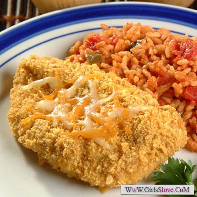 - يخفق الحليب مع البيض في وعاء صغير ,, ويغمس الدجاج فيه ومن ثم يغطى بالبقصمات ,, ويوضع في وعاء الطهي للفرن ,, يطبخ لمده 35 او 40 دقيقة او الى ان يستوي الدجاج ويشقر لون البقصمات ,, في وعاء اخر تخلط الاجبان مع الكريمة الحامضة وتزين الدجاج بها وتقدم مع الرز المكسيكي ,,
